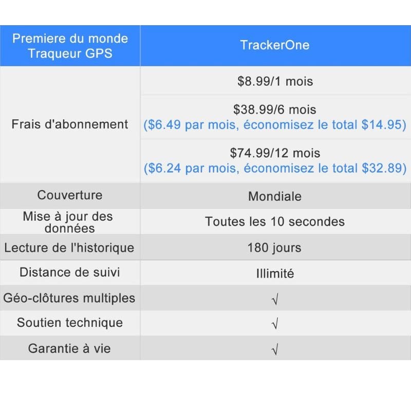 - L’application payante « TrackerOne » est requise au tarif de 8€ par mois